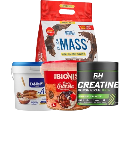 يحتوي Smart Mass Pack على ماس غينر Applied Nutrition وشوفان بيونيس وكرياتين F&H وغرانولا بيونيس لزيادة عضلية صحية ومتوازنة.